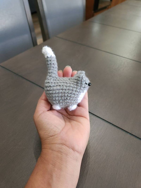 This a mini grey crochet kitten, perfect for cat lovers. It makes a great gift and can be placed in your car, on a book shelf, in a craft room, or bedroom. This kitty will add so much cuteness to your home.
