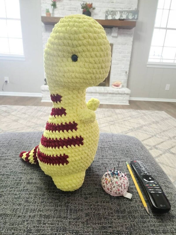 This cute T-Rex is made from limeade sparkle Bernat baby blanket yarn. It makes a great gift for dino lovers or buy it for yourself to add some cuteness to your home.